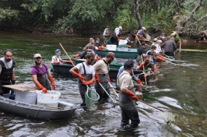 Les pêcheurs, immergés jusqu’à la taille, alignés sur toute la largeur du cours d’eau, ont parcouru, lentement près de 200 mètres. Les uns, munis d’une électrode, avaient pour mission d’endormir les poissons. Les autres, équipés d’épuisettes, les prélevaient pour les remettre à une équipe postée sur la rive.