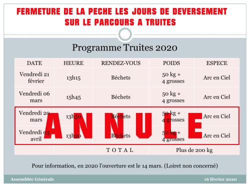 Suite aux annonces gouvernementales, les déversements de truites sont annulés. Merci de votre compréhension…